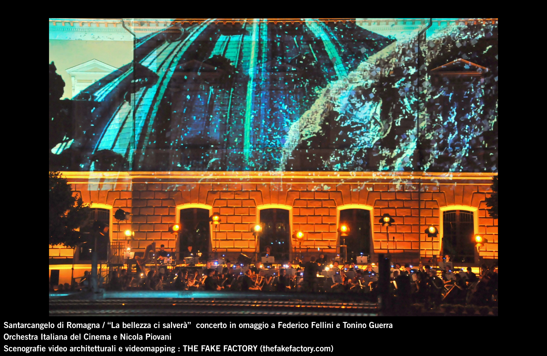 the fake factory videomapping concerto santarcangelo Federico Fellini Tonino Guerra_00001 Published August 25, 2013 at 1920 × 1250 in SANTARCANGELO DI ROMAGNA “La bellezza ci salverà” ORCHESTRA ITALIANA DEL CINEMA e NICOLA PIOVANI : concerto per FEDERICO FELLINI E TONINO GUERRA