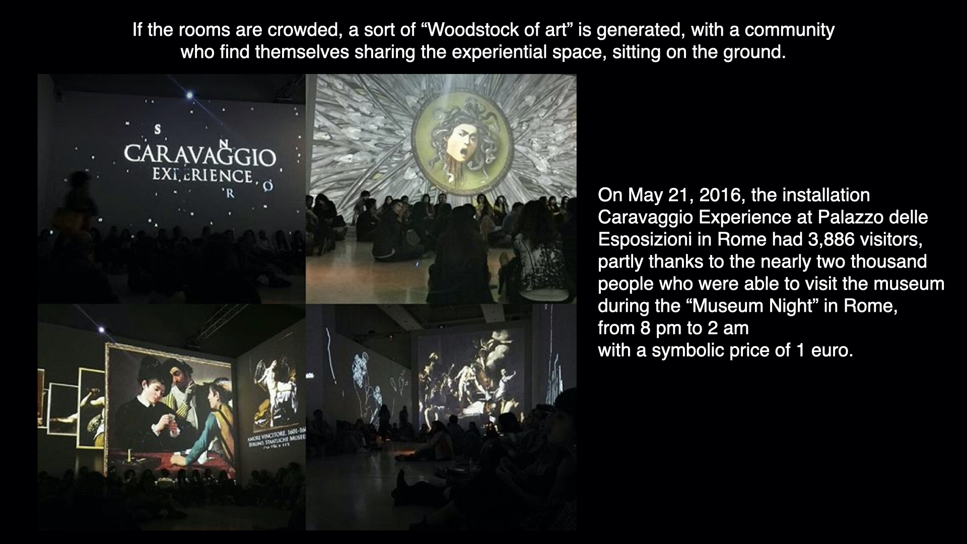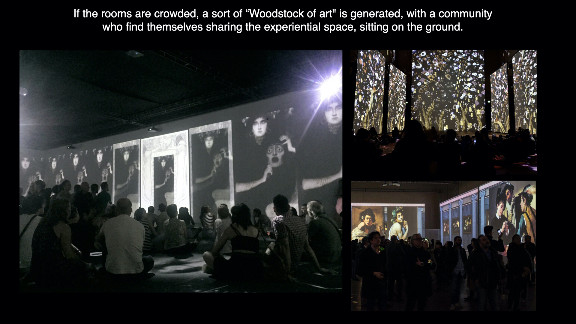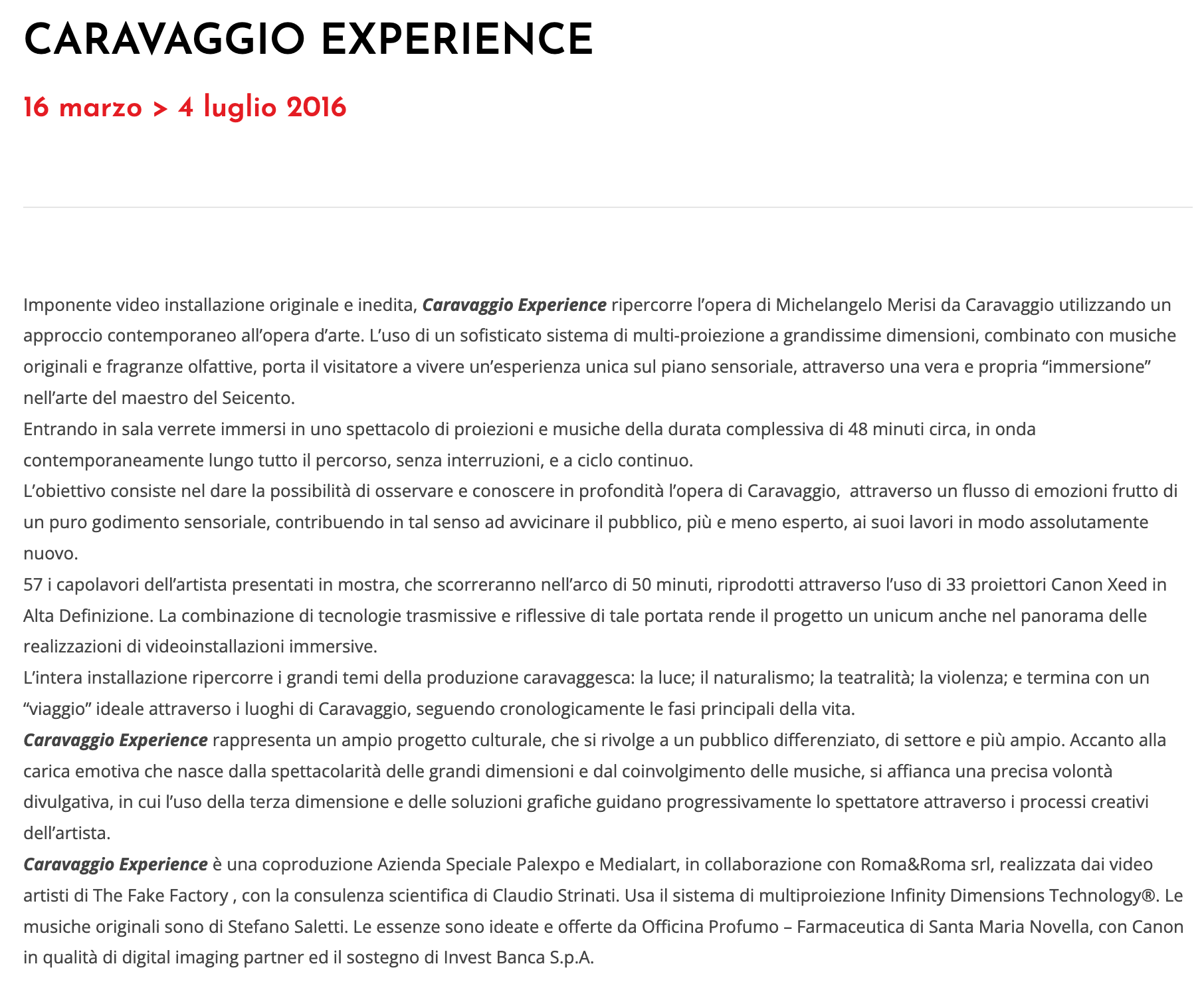 Il 16 marzo 2016 con “Caravaggio Experience” al Palazzo delle Esposizioni di Roma nascevano ufficialmente le mostre multimediali itineranti chiamate “experience”. Non che non esistessero prima delle “mostre multimediali su pittori del passato”: da oltre un decennio il regista Peter Greenaway reinterpretava i classici nelle sue installazioni multimediali e dentro alle cave di Les Baux-de-Provence (Cathedrale d’Images) il fotografo Plecy aveva ideato spettacoli con diapositive proietta su grandi pareti naturali. Anche la prima mostra itinerante a pagamento era stata ideata nel 2010 da un gruppo australiano e si chiamava “Van Gogh Alive”.