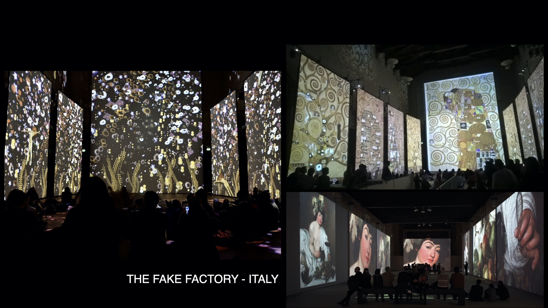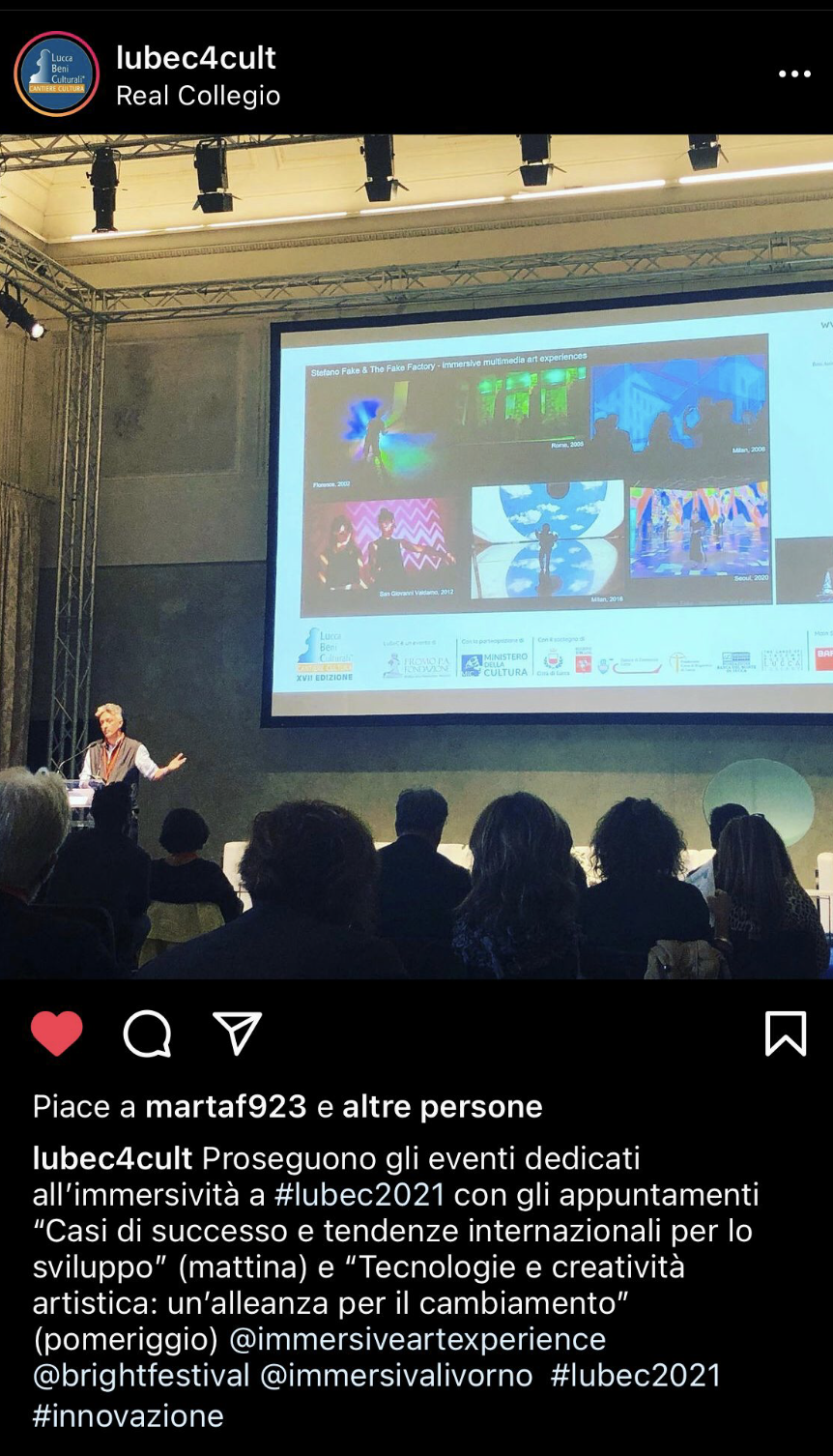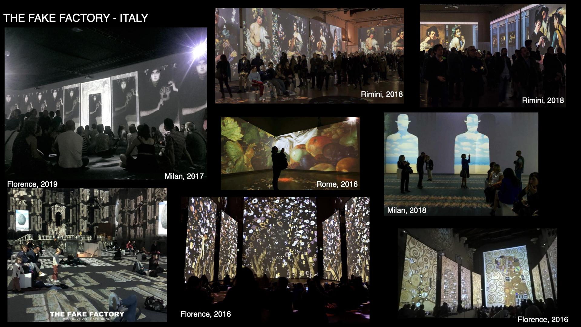 Ma è con Caravaggio Experience al Palazzo delle Esposizioni di Roma e poi Klimt Experience alla chiesa di Santo Stefano al Ponte di Firenze, che nascono le “immersive art experiences” contemporanee, con un format pensato per essere itinerante e modulare, con proiezioni che coprivano interamente pareti e pavimento, e con uno stile che univa motion graphic e proiezioni di pitture. Dopo il successo mediatico e di pubblico di queste due opere multimediali (da allora definite a livello globale “experience”), entrambe ideate e dirette da Stefano Fake (THE FAKE FACTORY), il format è esploso nel mondo e moltissime case di produzione si sono organizzate per mettere in scena le opere del passato, reinterpretandole con linguaggi e tecnologie contemporanee. Oggi il format delle immersive art experiences è ormai consolidato e in molte città del mondo stanno nascendo centri permanenti dedicati a questo tipo di esperienze multimediali.