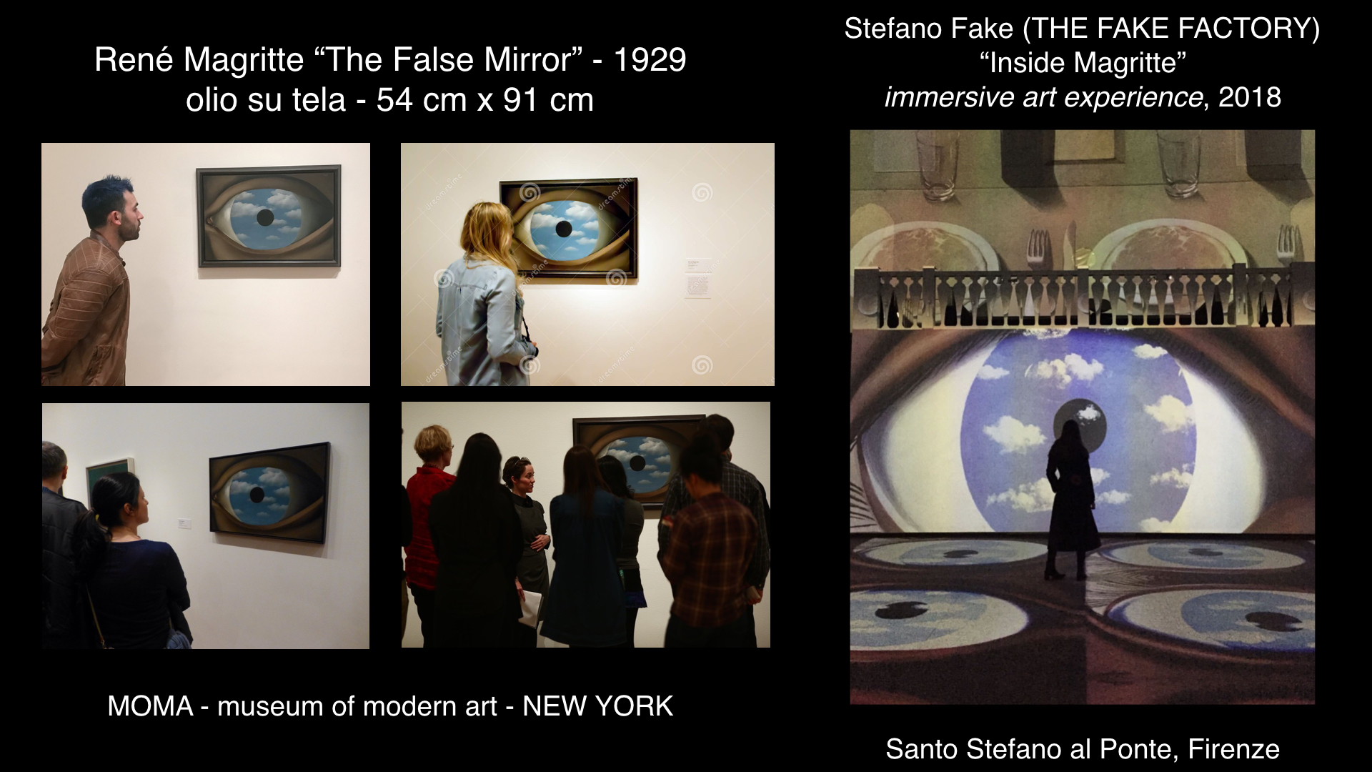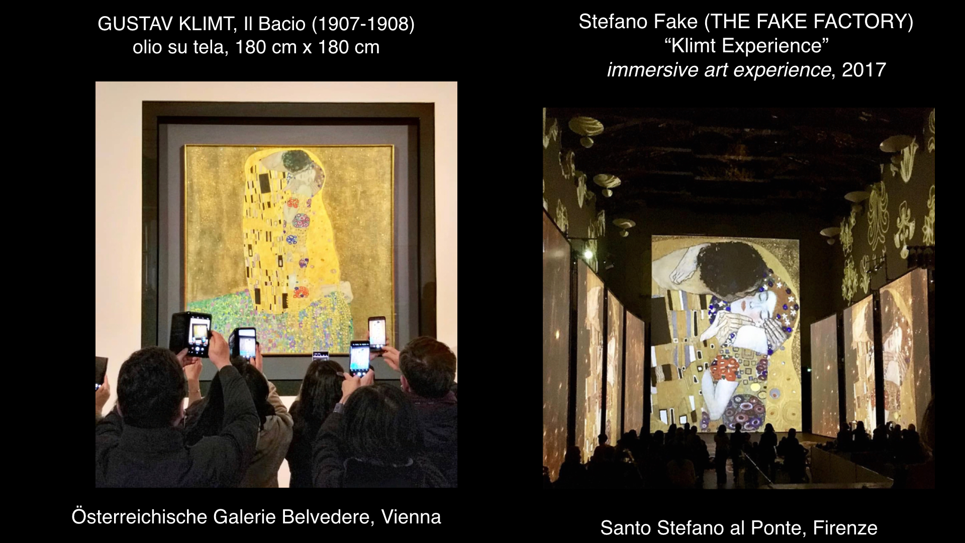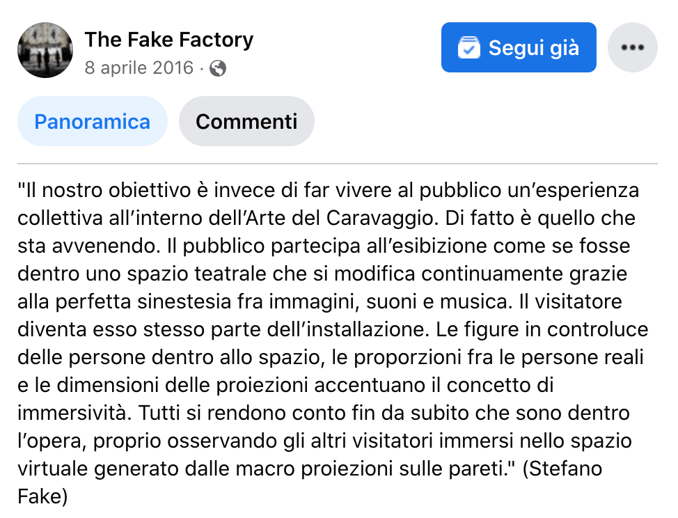 Ma è con Caravaggio Experience al Palazzo delle Esposizioni di Roma e poi Klimt Experience alla chiesa di Santo Stefano al Ponte di Firenze, che nascono le “immersive art experiences” contemporanee, con un format pensato per essere itinerante e modulare, con proiezioni che coprivano interamente pareti e pavimento, e con uno stile che univa motion graphic e proiezioni di pitture. Dopo il successo mediatico e di pubblico di queste due opere multimediali (da allora definite a livello globale “experience”), entrambe ideate e dirette da Stefano Fake (THE FAKE FACTORY), il format è esploso nel mondo e moltissime case di produzione si sono organizzate per mettere in scena le opere del passato, reinterpretandole con linguaggi e tecnologie contemporanee. Oggi il format delle immersive art experiences è ormai consolidato e in molte città del mondo stanno nascendo centri permanenti dedicati a questo tipo di esperienze multimediali.