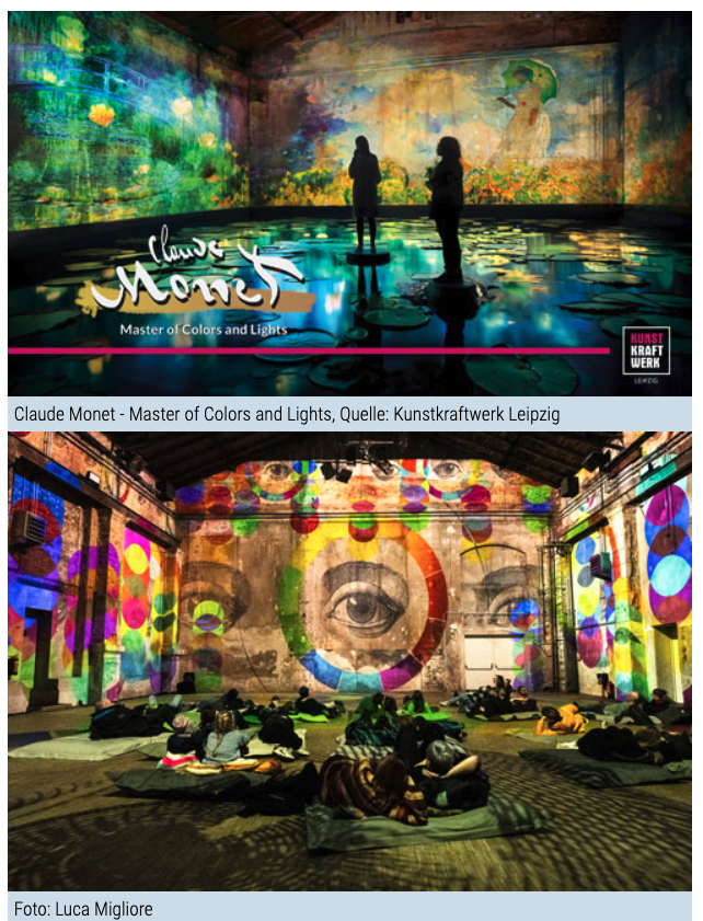 Mit der immersiven Ausstellung „Claude Monet – Master of Colors and Lights“ folgt das Kunstkraftwerk den beiden Hauptelementen des Impressionismus: Farbe und Licht. Nach einer kleinen Übersicht auf vier großen Monitoren im Foyer zum Künstler und seinem Leben empfängt STEFANO FAKE & THE FAKE FACTORY in der Maschinenhalle das Publikum mit der zentralen großen immersiven Multimedia-Show. Verbunden mit einer kurzen Werkeinführung verarbeitet der Multimedia-Künstler STEFANO FAKE & THE FAKE FACTORY in der Main Show mehr als 300 Gemälde und Skizzen Monets zu 15 bis 17 Szenen. In 35 Minuten bekommen die Besucher auf eine ganz neue und hautnahe Art Zugang zu Monets wichtigsten Werken, der En- Plain-Air-Malerei, seinem Licht- und Farbenspiel sowie wichtigen Schauplätzen in seinem Leben – Paris, der Boulevard, das Theater, die Kathedrale von Rouen oder der Garten von Gyverny. Die Eindrücke, Werke und Szenen werden durch aktuelle Musikgenres mit Sound untermalt.