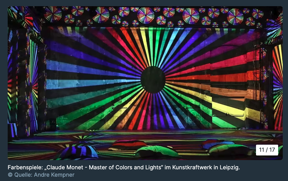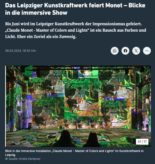 Er gilt als Namensgeber des Impressionismus in der Malerei: Claude Monet. Mit der neuen Ausstellung „Claude Monet: Master of Colors and Lights“ ab 8. Februar setzt das Kunstkraftwerk sein Werk und Wirken vielfältig und atemberaubend in Szene. Seine Kunst wird auf dem alten Fabrikgelände in immersiven Multimedia-Shows, Installationen und Räumen auf verspielte kreative Art interpretiert und mitunter auf die Spitze getrieben.